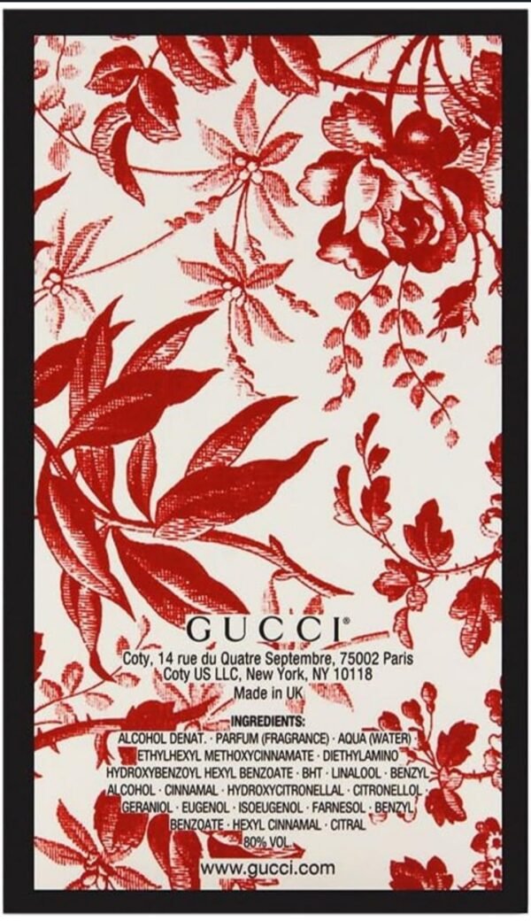 A vintage powder pink shades the lacquered porcelain square-shaped bottle, appliqu??d with the Gucci label ribbed and framed in black. The outer carton is covered inside and outside in Herbarium, a red-and-white toile de Jouy House print of leaves, cherry branches and flowers framed in black.